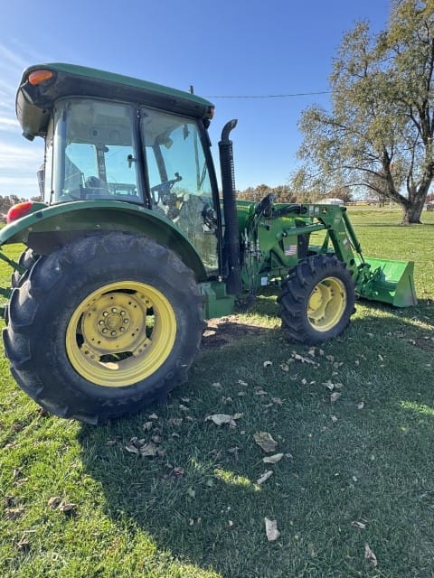 - JD 5100E w/ H240 loader, 1,822 hrs, heat & AC, 4×4, clean tractor. Front tires 90%, rears 70%.